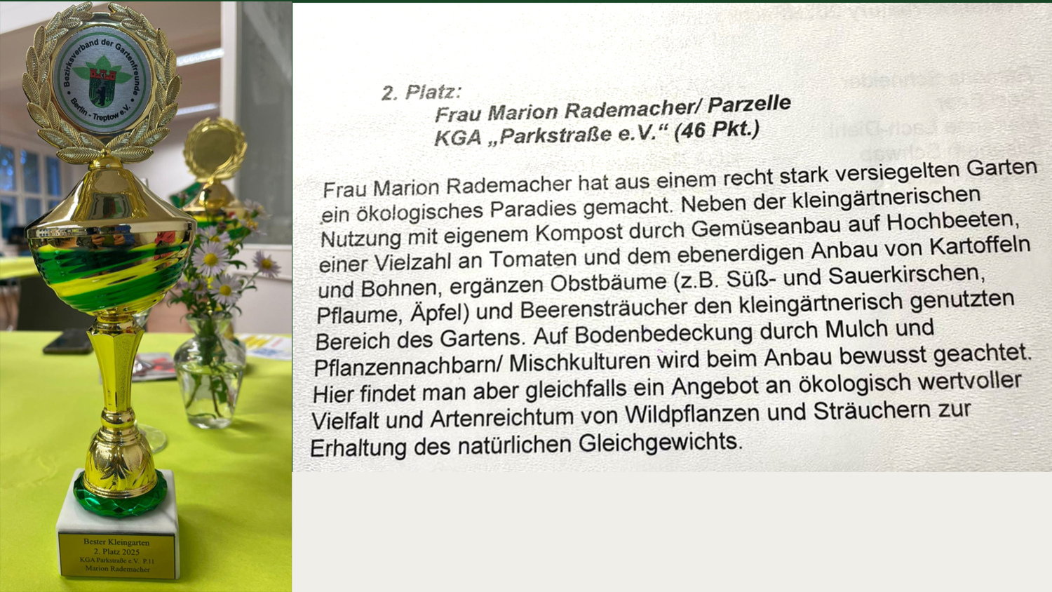 Wir freuen uns mit unserer Gartenfreundin Marion Rademacher (Parzelle 11/12) über die Anerkennug und Ehrung ihrer gärtnerischen Leistungen durch den Bezirksverband der Gartenfreunde Treptow für den 2.Platz des besten Kleingartens.